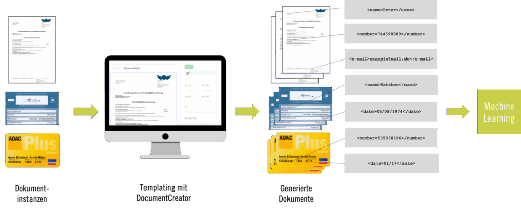 Gone are the days when the quality of machine learning models was limited by insufficient test and training data. DocumentCreator permits to generate unlimited amounts of semantically fully annotated document variations based on just a few original input specimens. DocumentCreator is particularly helpful in cases where documents for test or training data are few in number or cannot be used to train machine learning models because of data confidentiality, copyright issues or insufficient or inaccurate target value annotations. DocumentCreator is available as on-premise solution or as a software as a service (SaaS).