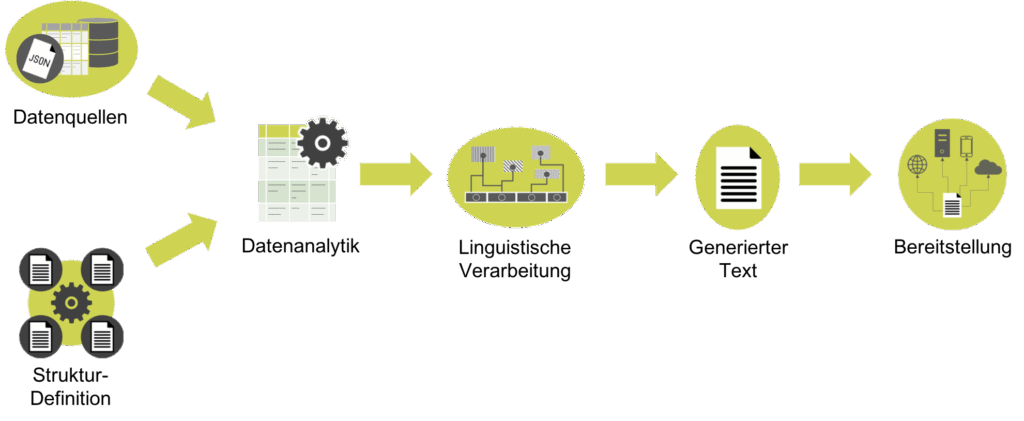 Our team of computational linguists create dynamic text modules and analytical functions based on your requirements regarding content and structure. TextWriter’s analytical engine analyses incoming data, textualises gained insights and embeds them into an appropriate analytical context. The resulting texts will be generated in multiple languages and customised for different target groups. The output texts are then ready for use, made available in different output formats and across various interfaces according to your specific needs.
