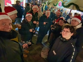 Nach der VR-Action ging es weiter in die Altstadt — zum Weihnachtsmarkt auf der Fleetinsel. Direkt an den Fleeten gelegen, verströmte der Markt einen ganz besonderen winterlichen Charme: Lichter spiegelten sich im Wasser, der Duft von Gewürzen lag in der Luft, Holzbuden luden zum Stöbern ein, und Glühwein oder heißer Punch wärmte uns von innen. Der Markt war genau das Richtige, um in gemütlicher Runde bei winterlicher Stimmung durchzuatmen.